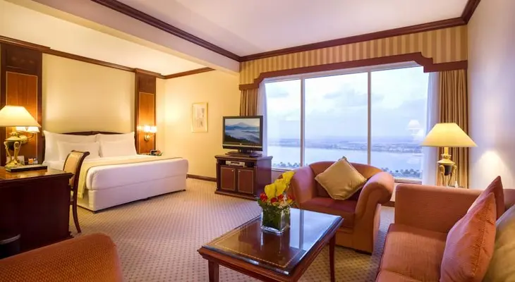 "Elegant expansive rooms with splendid views over the Corniche and Lulu Island and out to sea. Ideally positioned for sightseeing, the small swimming pool is a disappointment."