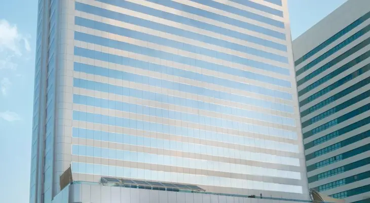 “The upscale Corniche Hotel Abu Dhabi is a sophisticated, centrally located property with traditional decor behind its high-rise glass exterior.”
