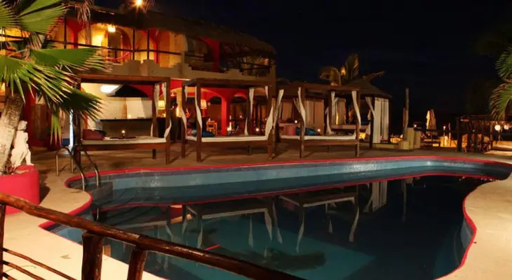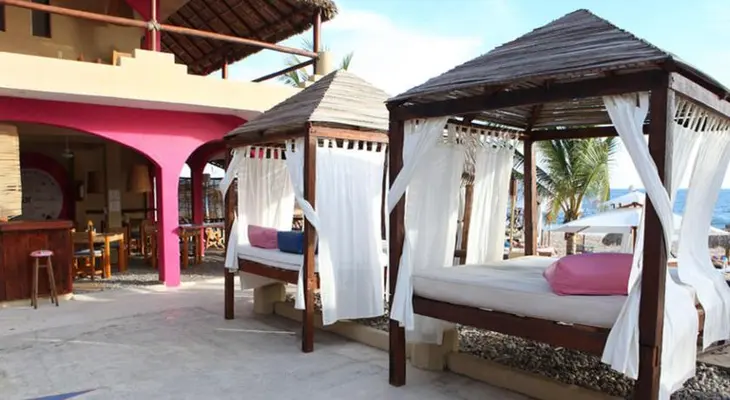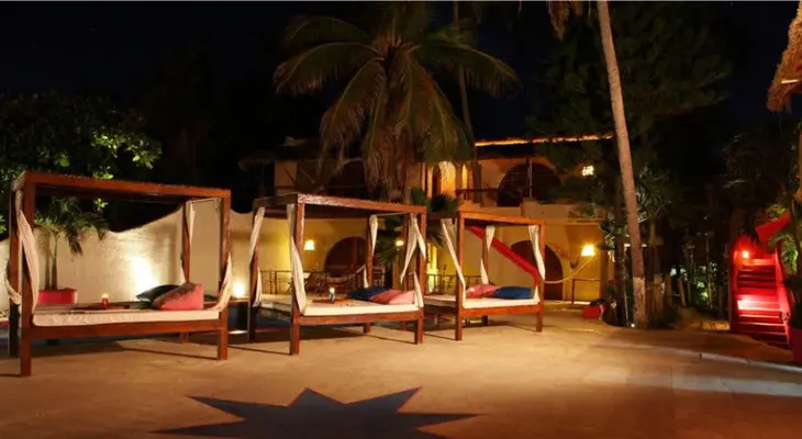 “Rustic chic epitomised, this intimate beachside enclave has colourful, breezy rooms with tiled private bath and mosquito nets (some have a/c).”