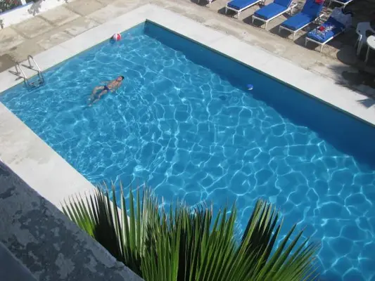 "It has a variety of simple, comfortable rooms surrounding a central garden and sizable pool. The priciest rooms upstairs are larger and include sea-view terraces and large hammocks." Full review