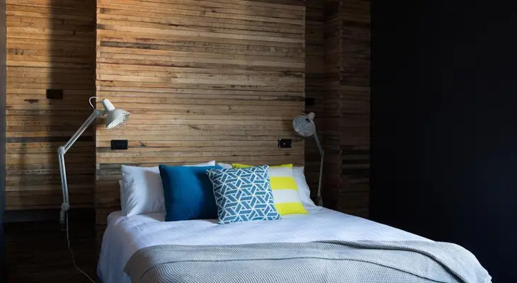 “Painted a chic charcoal with bright glossy yellow doors and rustic wood panelling, rooms range from deluxe to premium, and each comes with its own Nespresso machine, fridge and iPod dock.”