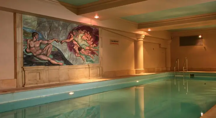 “Showy chandeliers illuminate a movie-set-like celebration of art nouveau in the lobby of this luxury hotel.”