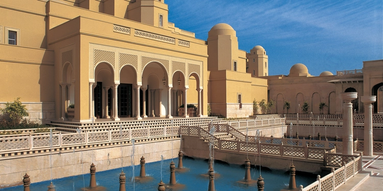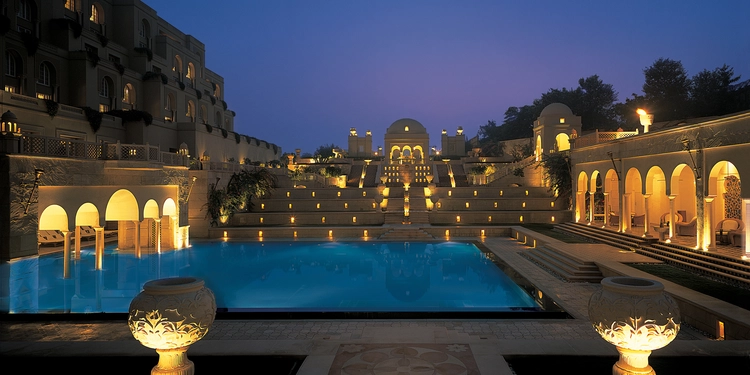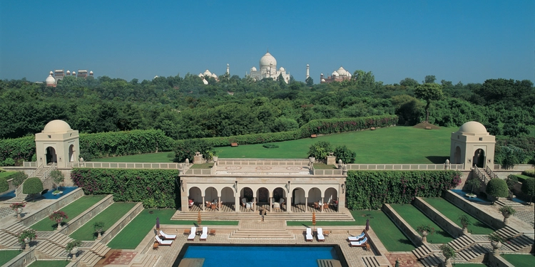 “Dazzling hotel built in the style of a Mughal palace, amid nine acres of landscaped gardens, reflecting pools and fountains just 660 yards from the Taj Mahal.”