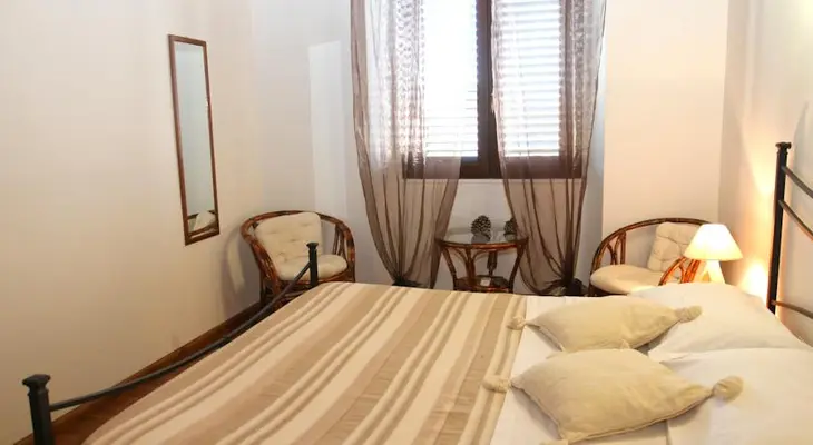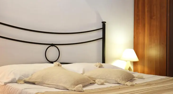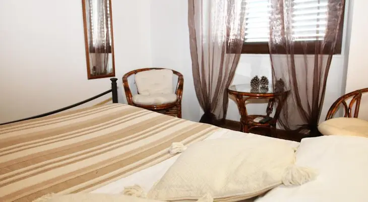 “With its bright-blue walls and white wood-beamed ceiling, the camera Mediterranea is one of three individually decorated rooms at this welcoming B&B.”