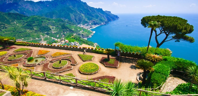 "Within the historic center of Ravello is the Villa Rufolo, a stunning example of regional 13th-century architecture with beautiful Italianate gardens overlooking the blue water below"