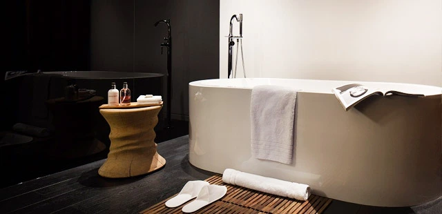 “Indulgent in a minimalist way, with dashes of both Japanese modernism and midcentury Scandinavian design in the black wooden floors, oversized white soaking tubs, and all the latest technology.”