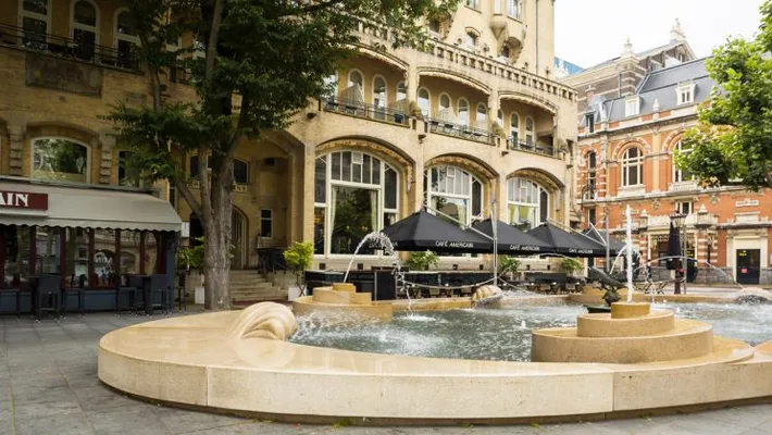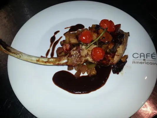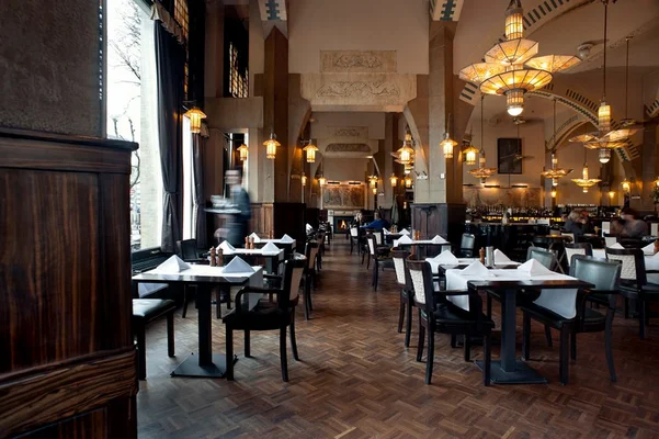 "Cafe Americain is a stylish Art Deco restaurant featuring a magnificent ceiling, with fine brasserie cuisine which attracts a mixed crowd. Jazz brunch on Sundays."