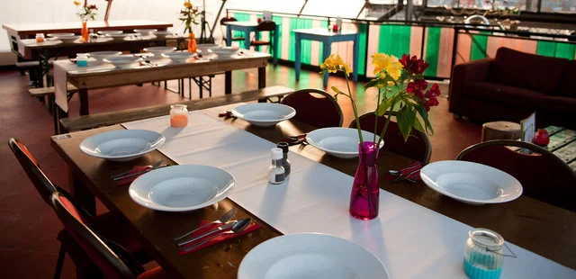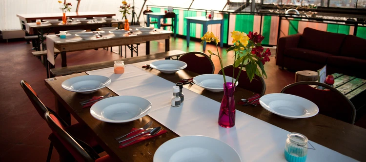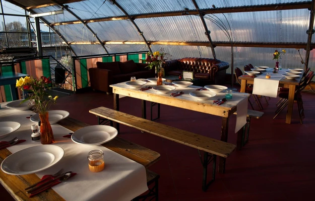 “Café Noorderlicht , in a Tibetan-prayer-flag-draped greenhouse, provides food and drinks in a funky ambience. To find it, look for signs posted from the ferry dock.”