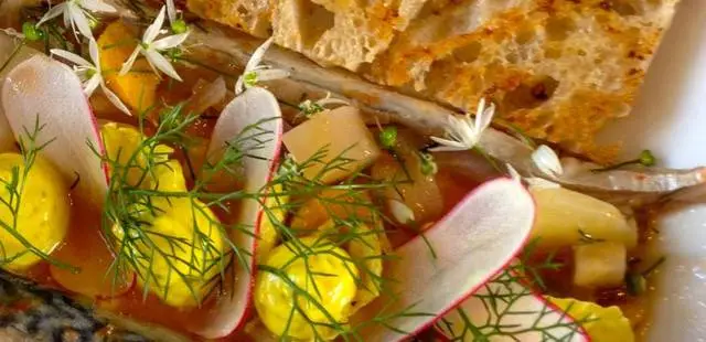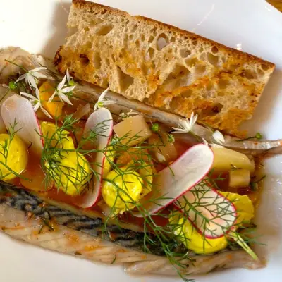 "Sourcing from local farms, he makes favorites like grilled sea bass, duck breast with red cabbage, and pumpkin ravioli with roasted pistachios."
