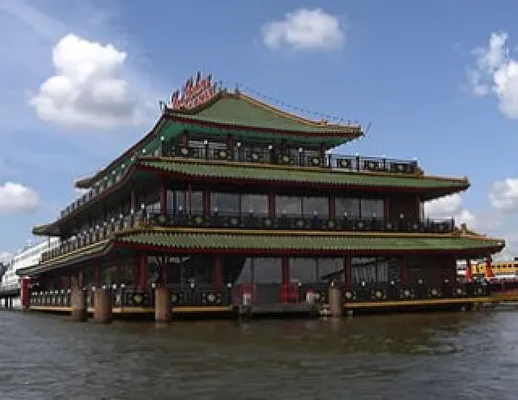 “This floating, pagoda-style Chinese restaurant is an impressive sight on a small dock.”