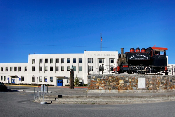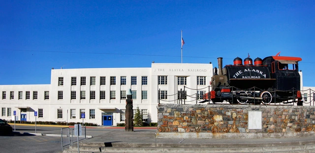 “Totem poles and a locomotive built in 1907 are outside the station, the headquarters of the Alaska Railroad since 1915.”
