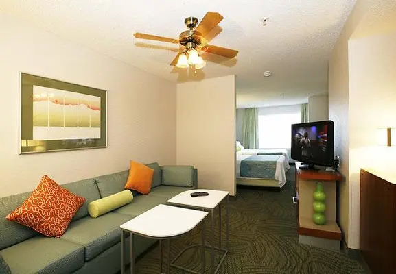 “Spacious one-room suites have separate living and sleeping areas with either a king bed or two double beds plus a pullout sofa, microwave, mini-refrigerator, and flat-screen TV.”