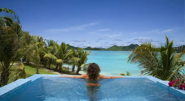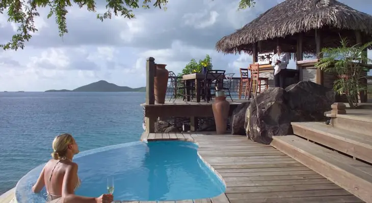 “Climbing the hill from Flyes Bay is a collection of pastel cottages offering luxurious rooms with hammocks, balconies, and king-sixed beds.”