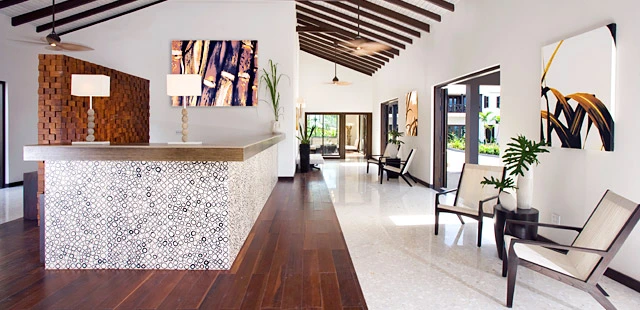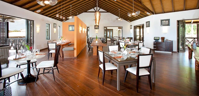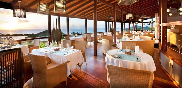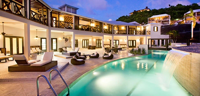 "This luxury hotel is nestled into a sugarcane-covered hillside and offers panoramic views of the Caribbean sea and neighboring islands."
