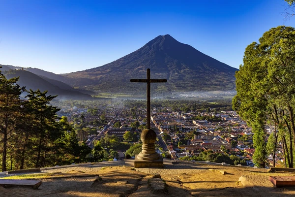The view from this hillside perch north of the city, with its cross in the foreground, city rooftops and Volcán Agua in the background, is Antigua's best-known postcard vista. — Fodor's