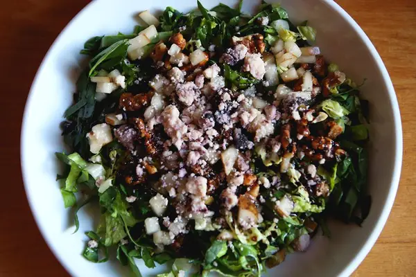 Organic red cabbage, sweet carrots, juicy cherry tomatoes, crisp cucumbers, and fresh sprouts topped with beet pate, an avocado, a side of sauerkraut and lemon-tahini dressing. — Afar Magazine