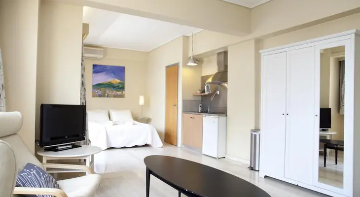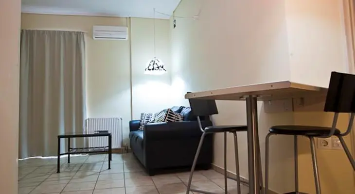 “Furnished apartments for up to six people, with kitchen, sitting room, TV, a/c and linen provided.”