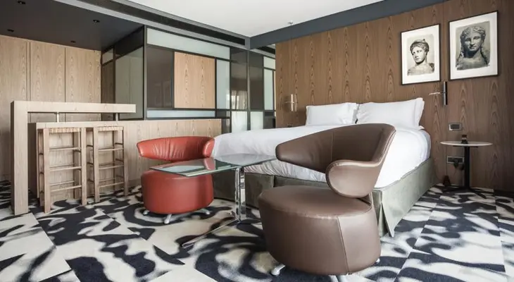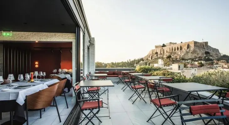 “The hotel’s rooftop bar and unobstructed up-close views of the Acropolis are major draws, as are the 20 Mod-ish rooms with Le Corbusier armchairs and Warren Platner coffee tables.”