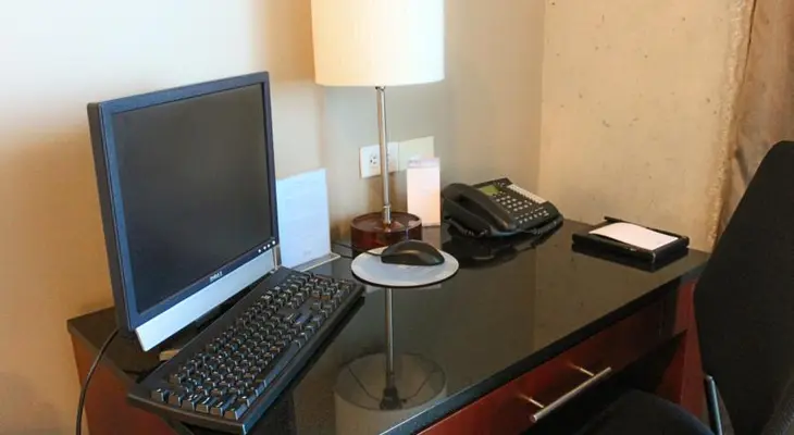 "Every unit of this upscale all-suite hotel features full kitchens, designer toiletries and a high-tech interactive system that allows guests to make all requests... from an in-room computer terminal."