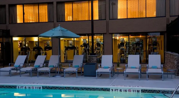 “The 342 rooms and seven suites offer a wide range of amenities, including ample electrical outlets for charging cell phones and other business equipment.”