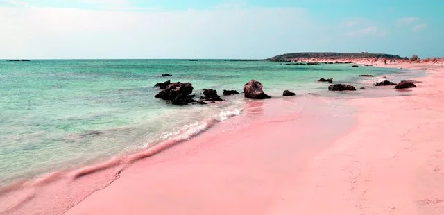 “Pink Sands Beach is a 5km-long beach whose pink colour comes from tiny bits of shells mixed in with white sand.”