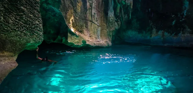 “Thunderball Grotto is an accessible underwater cave that sits in the middle of a little island (probably better categorised as a big rock) in The Exumas.”