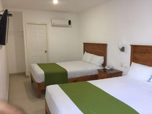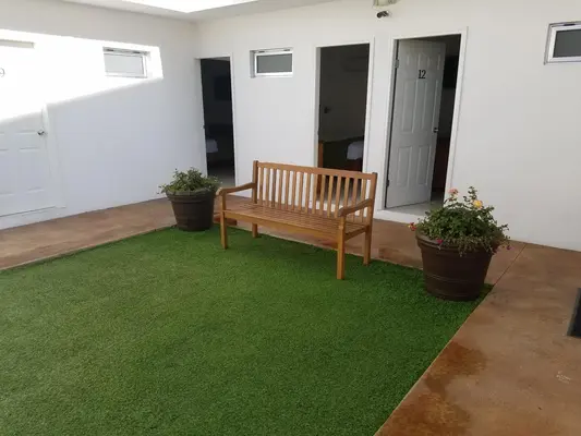 “Opened in 2014, this small modern hotel, just off La Revo, has motel-style rooms set around a small astro turf garden.”