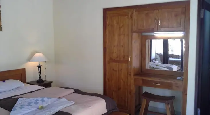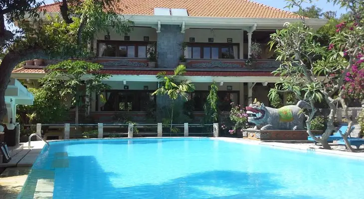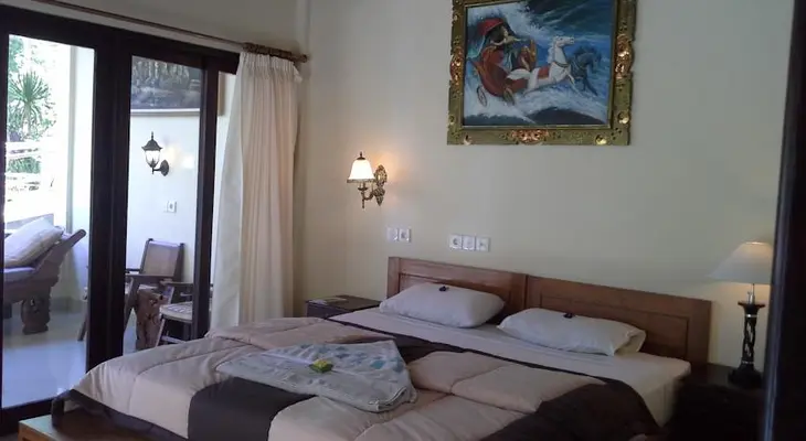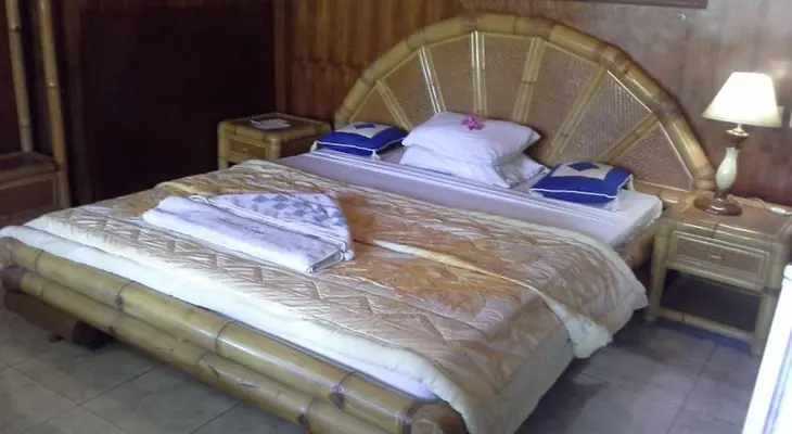 “This Amed empire features a range of 30 bungalow-style rooms mostly on a hillside across from the beach.”