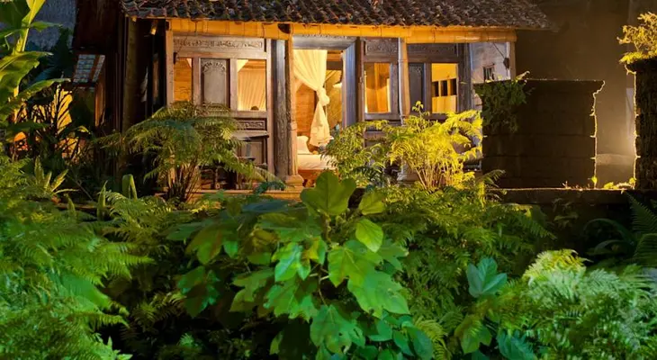 “The four hand-carved wooden houses transported from Java, each more than 100 years old, are set amid rice fields on the Sayan Ridge, an ethereal Eden near Ubud.”