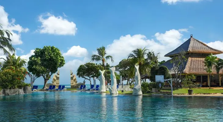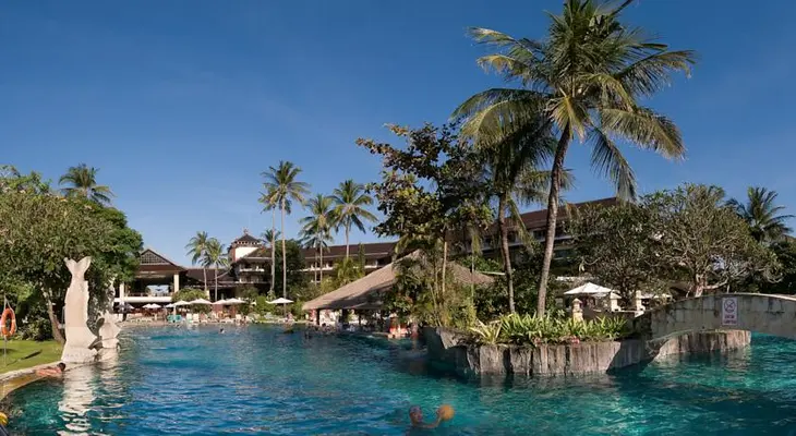 “This upper-middle-range, 381-room hotel is located right on Kuta Beach next to the Discovery Shopping Mall.”