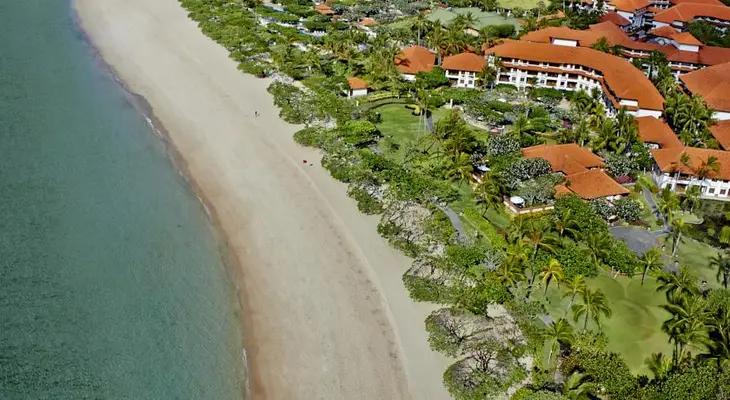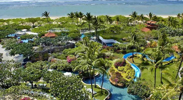 “Located in Nusa Dua, the Grand Hyatt Bali has its own quiet stretch of beach but is also convenient to major attractions like the Museum Pasifika and Turtle Island.”