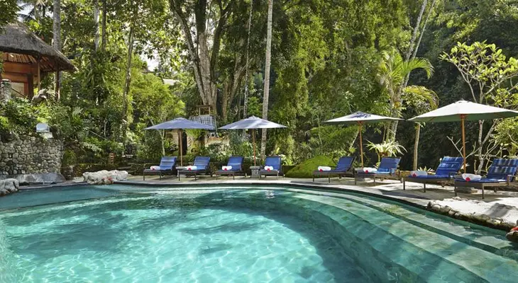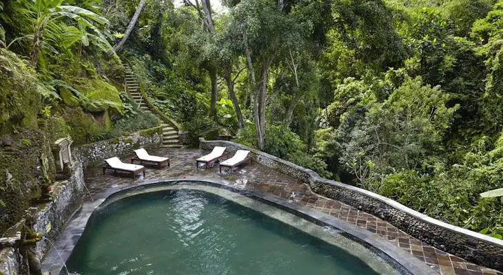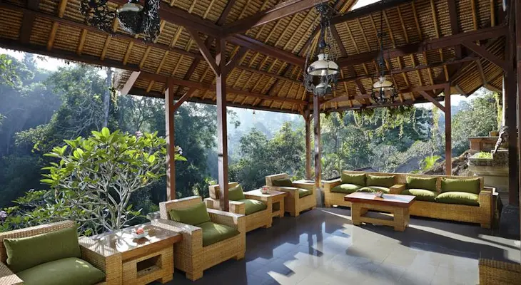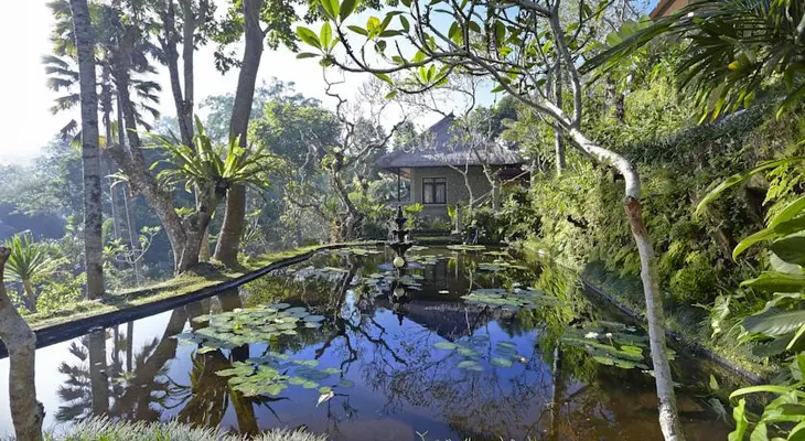 “This hotel is a tropical sanctuary with terraces that lead to a beautiful gorge, the Tjampuhan River, and the Gunung Lebah Temple.”