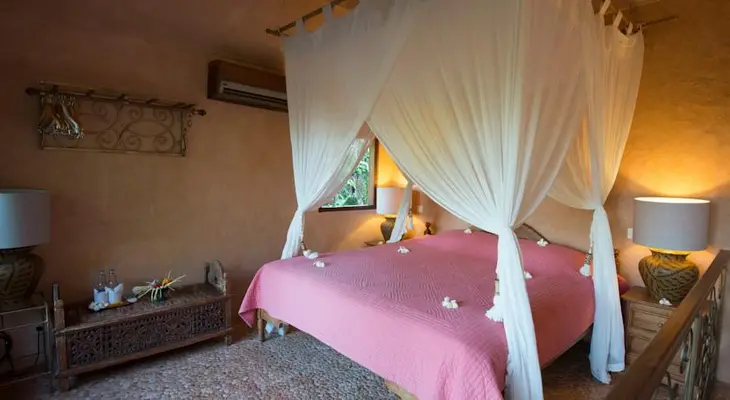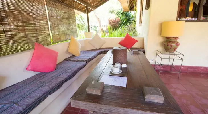 “The rooms are a harmonious blend of Italian and Balinese styles, featuring thatched roofs, handcrafted antiques, and terrazzo bathrooms.”