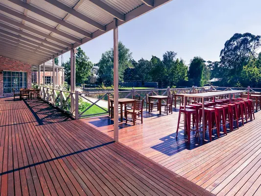 “This single-story accommodation is spread out over a large property dotted with gum trees next to Sovereign Hill; rooms are furnished in classic style, with dark green and timber notes.”