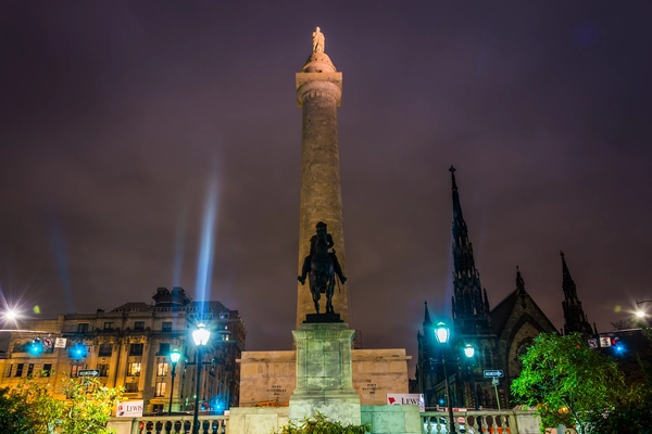 The impressive monument was the first one dedicated to the nation's first president. An 18-foot statue depicting Washington caps the 160-foot white marble tower. — Fodor's