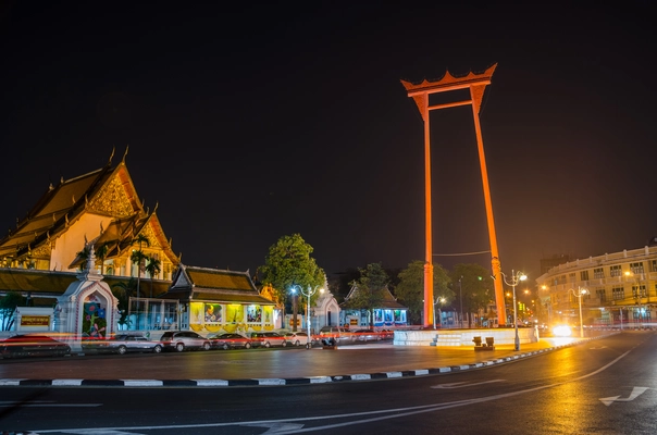 The huge teak arch -- also carved by Rama II -- in front is all that remains of an original giant swing, which was used until 1932 to celebrate and thank Shiva for a bountiful rice harvest, and to ask for the god's blessing on the next.