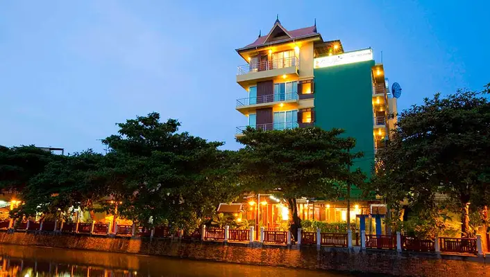 "This hotel is located on a canal in the old city, and entered via a footbridge. All the rooms have balconies and are paneled in old teakwood."