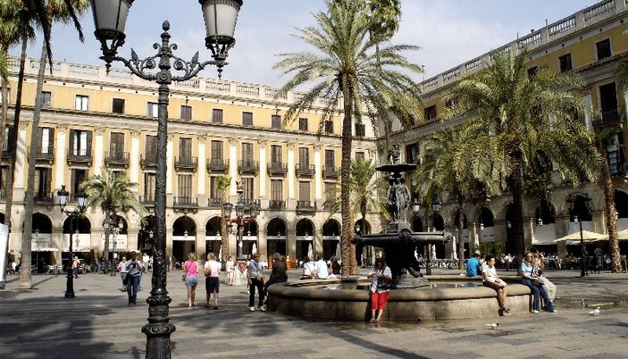 This harmonious square (1840-50) at the heart of the Barri Gòtic is made up of uniform buildings with Corinthian pillars and arcades. — Michelin Guide