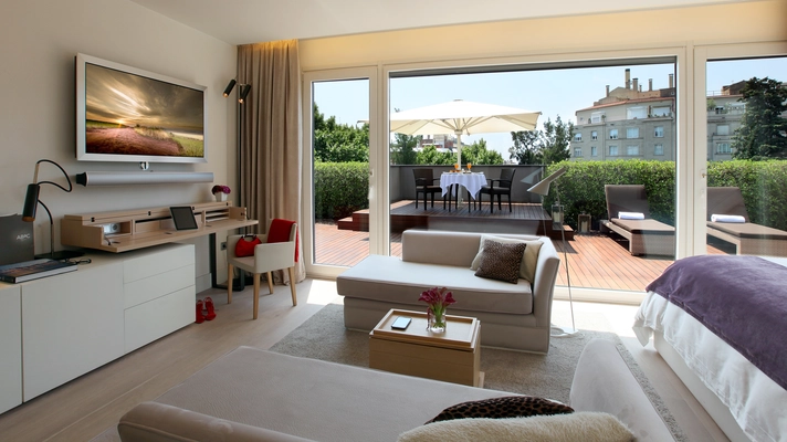 "Spectacular guestrooms with a contemporary look, featuring top-quality furnishings, the latest technology and even colour therapy in the bathrooms. Modern spa."