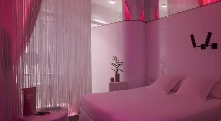 "The 31 rooms mix glamour and comfort with laugh-aloud conceits like adjustable moodlighting, sashaying plastic curtains and mirrored walls."