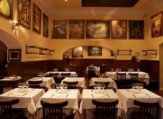 “Deep in the Gothic labyrinth lies this classic eatery. A series of cosy dining areas is connected by broad arches while, high up, the walls are tightly lined by artworks.”