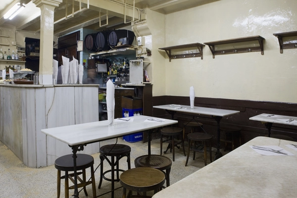 "Behind brown wooden doors on Barceloneta's market square (there's no sign) is 1his rough-and-ready tavern wi1h battered marble tables and antique barrels."