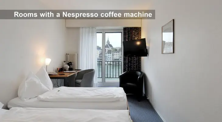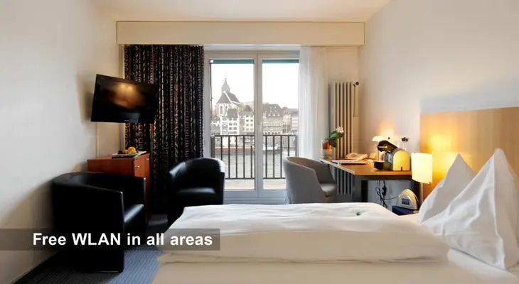 "In the heart of Basel along the Rhine, a 10-minute walk from the train station... Standard rooms are comfortably furnished; business class, junior suite and suites also available."