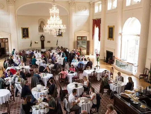 “The 18th-century Pump Room, with views over the Roman Baths, serves morning coffee, lunches, and afternoon tea, to music by a pianist or string trio who play every day.”