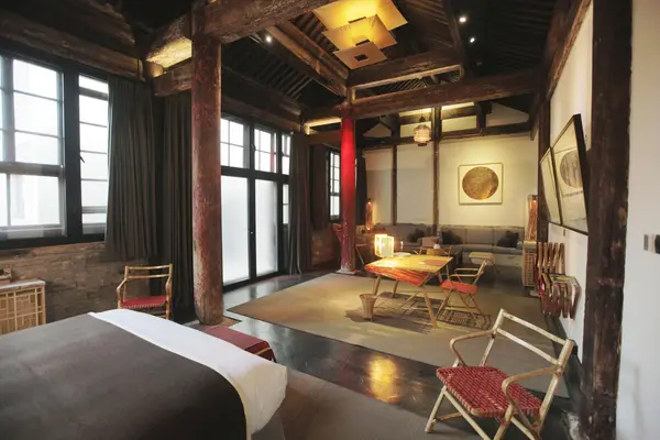 "All the decor is a mix of old and new. In the Imperial Suite, mid-century sofas and lighting by Ingo Maurer complement Qing dynasty–era wood ceilings." Full review