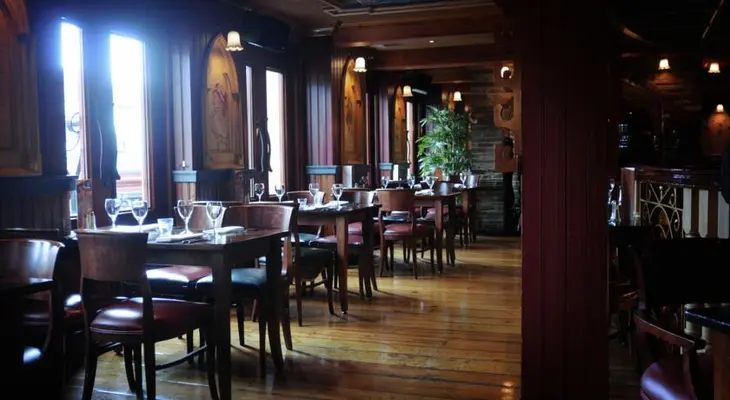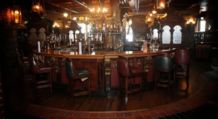 "Stone arches, exposed bricks, immense columns and salvaged stained glass give this place a funky yet ecclesiastical look...retractable roof in the beer garden is a boon if rain makes and appearance."