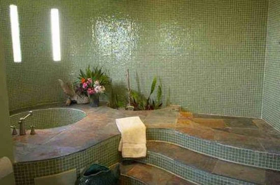 “Organic forms characterize these six gorgeous villas, with curved outer walls echoing curved couches and slate floors that sweep under cathedral ceilings, all encircling an estuary-like pool.”