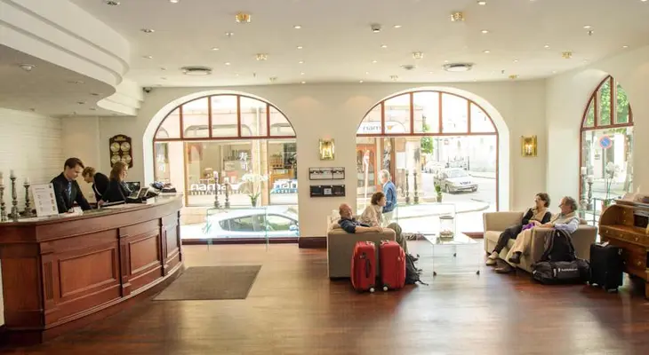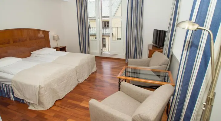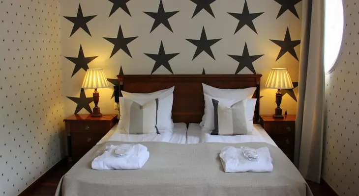 “Every room has a bathtub and is decorated in yellows and blues, with oak furniture and hardwood floors.”