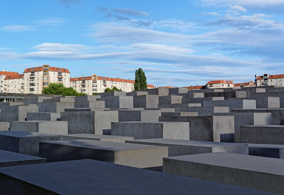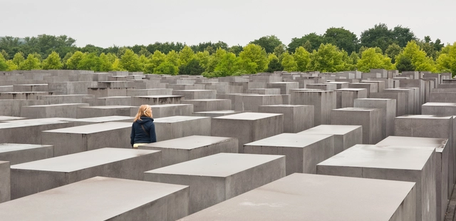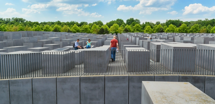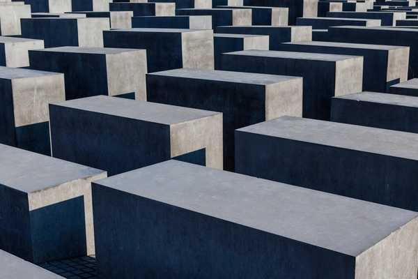 “Stark concrete blocks arranged in a grid pattern across an entire city block commemorate the Jews killed by the Nazis.”