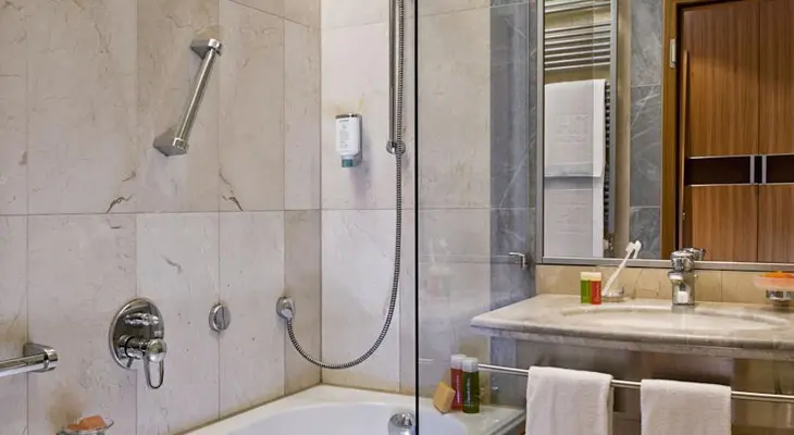 "Apart from its East Berlin location, the hotel’s main attractions are the spacious rooms, large lobby and inviting bar, all furnished with only the best materials."